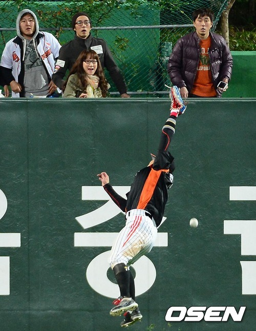 17일 오후 인천 문학구장에서 열린 2012 팔도 프로야구 플레이오프 2차전 SK 와이번스와 롯데 자이언츠의 경기,7회말 무사 정근우의 타구를 전준우가 놓치고 있다.