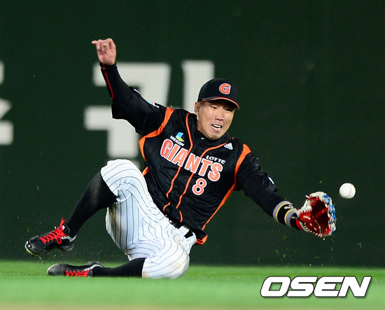 17일 오후 인천 문학구장에서 열린 2012 팔도 프로야구 플레이오프 2차전 SK 와이번스와 롯데 자이언츠의 경기, 9회말 1사 롯데 전준우가 SK 정근우의 타구를 놓치고 있다.