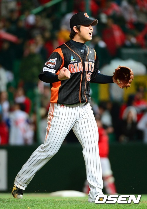 17일 오후 인천 문학구장에서 열린 2012 팔도 프로야구 플레이오프 2차전 SK 와이번스와 롯데 자이언츠의 경기,9회말 2사 2,3루 이호준을 내야땅볼로 처리 위기를 넘긴 김성배가 환호하고 있다.