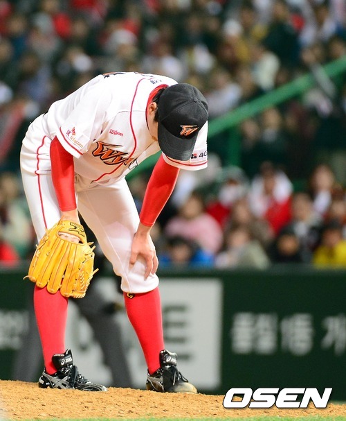17일 오후 인천 문학구장에서 열린 2012 팔도 프로야구 플레이오프 2차전 SK 와이번스와 롯데 자이언츠의 경기,10회초 2사 만루 정우람이 정훈에 밀어내기 볼넷을 내주고 아쉬워 하고 있다.