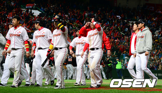 경기 종료 후 SK 선수들이 관중석을 향해 인사하고 더그아웃으로 가고 있다. /sunday@osen.co.kr