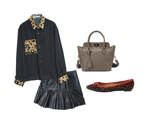 아찔한 시스루에 호피 무늬 패턴이 포인트로 가미된 블라우스는 여성스러우면서 섹시한 느낌을 한껏 고조시킨다. 블랙 컬러의 시스루 블라우스와 카키 컬러의 호피 무늬는 차분한 가을 분위기를 연출하고 과하지 않은 호피 패턴이다. 여기에 앙증맞고 발랄한 느낌을 가득 담아낸 가죽 소재의 플레어 스커트를 활용하면 귀여운 느낌까지 살린 패션이 완성된다.