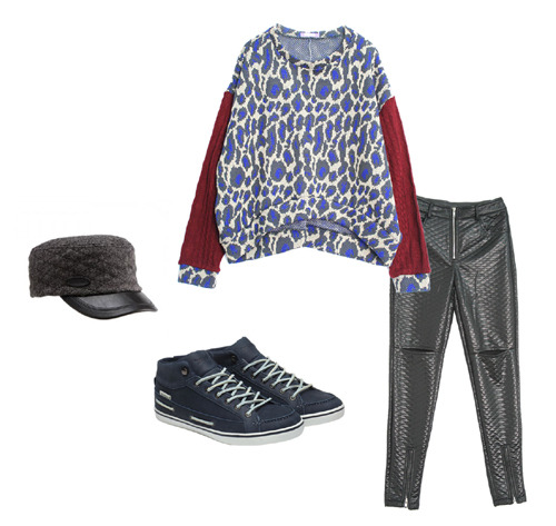 블루 톤의 호피무틔와 와인 컬러의 소매가 만나 트렌디한 느낌을 더하는 니트는 귀엽고 캐주얼한 패션에 제격이다. 박시한 디자인이라 여자의 몸매를 좀 더 슬림해 보이게 만들어 주고 따뜻한 니트 소재가 계절감까지 살려내는 일석이조 아이템이다. 여기에 엠보싱 소재의 레깅스를 활용해 활동성을 살리면 군더더기 없는 스타일을 연출할 수 있다.