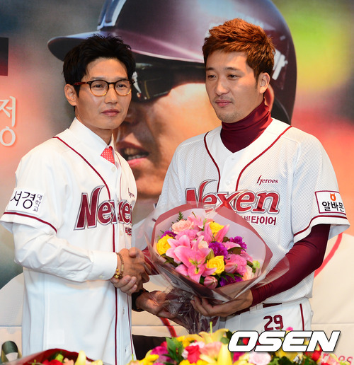 염경엽 감독이 이택근에게 꽃다발을 건네 받고 있다.