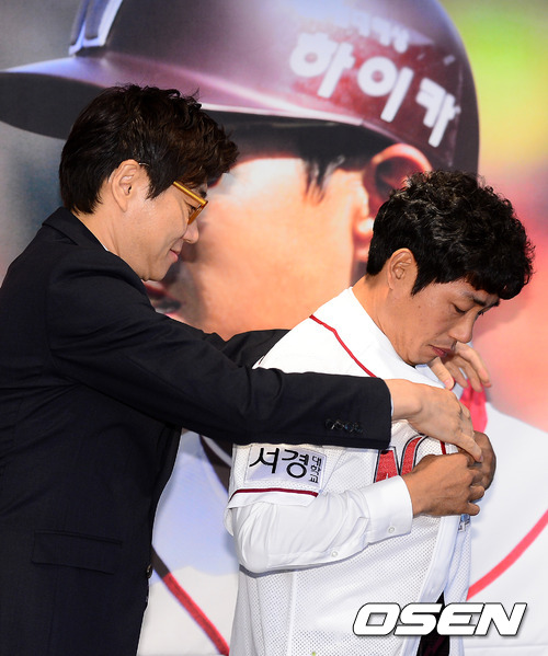 넥센 조태룡 단장이 최만호 코치와 착복식을 하고 있다.