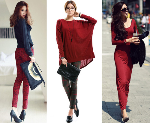 레드보다는 어두운 약간은 검붉은 빛을 띠는 버건디 컬러는 고혹적이고 우아한 느낌을 풍긴다. 하지만 스타일링 시 남용하면 촌스러운 연출이 될 수 있기 때문에 주의해야 한다. 그렇다고 코디 자체가 어려운 것은 아니니 누구나 쉽게 버건디의 매력에 빠져들 수 있다.