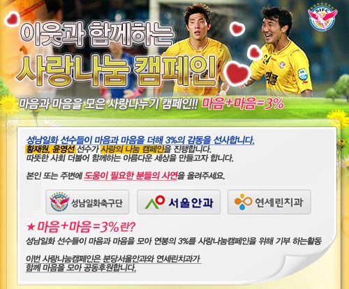 성남일화 선수들이 마음과 마음을 모아 연봉의 3%를 사랑나눔캠페인을 위해 기부하는 ‘마음+마음=3%’ 활동의 일환으로 진행되는 이번 캠페인은 안과 또는 치과시술이 필요한 분들의 이야기를 듣고 시술하여 마음을 나누는 따뜻한 행사가 될 예정이다.