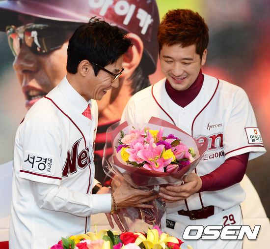 넥센 염경엽 감독이 이택근에 꽃다발을 건네 받으며 미소짓고 있다.