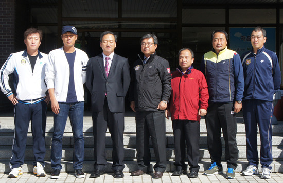 임완섭 코치, 유상철 감독, 최호택 교수, 전종구 사장, 김춘호 전무이사, 김동훈 코치, 다카스 피지컬 트레이너(맨 앞줄 왼쪽부터) / 대전 시티즌 제공.