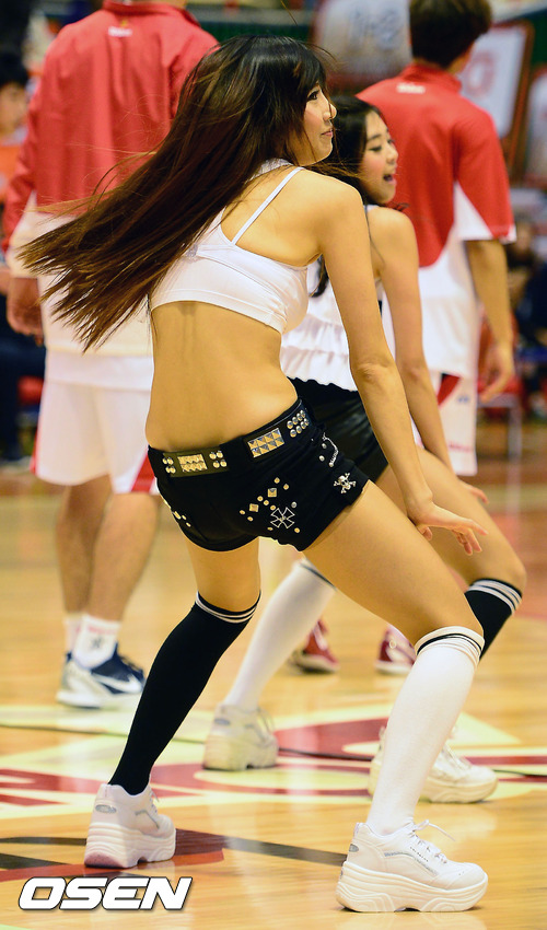KT 치어리더들이 경기 전 코트 위에서 화려한 공연을 펼치고 있다.