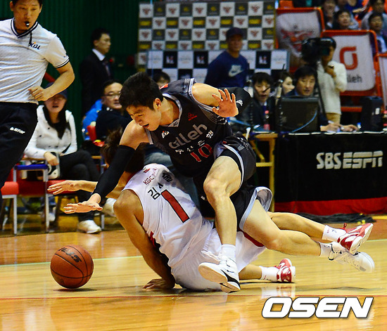 1쿼터 KT 조성민과 김태술이 치열한 볼다툼을 하고 있다.
