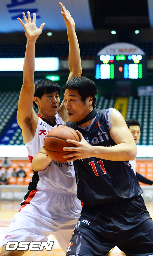 1쿼터 KT 서장훈이 KGC인삼공사 김민욱과 몸싸움을 하고 있다.