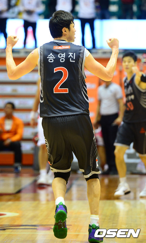 4쿼터 KT 송영진이 3점슛에 성공한 후 기뻐하고 있다.