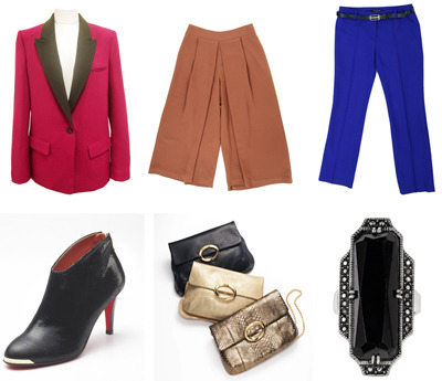 팬츠 자체가 넉넉한 사이즈이므로 너무 큰 사이즈의 가방 대신 손에 쥘 수 있는 작은 사이즈의 백이나 클러치를 매치해 에지 있게 연출 하는 것이 좋다. 디테일이 너무 화려한 구두 보다는 심플한 부티가 모던하면서 섹시한 느낌을 강조해 준다. 이때 굽이 높을수록 더욱 아찔한 스타일이 연출된다. 이번 시즌 유행인 레더 소재 팔찌와 볼드한 스타일의 반지를 여러 개 착용하면 더욱 화려하고 트렌디한 느낌이 완성된다.