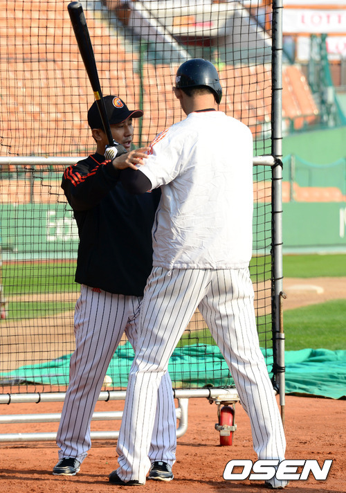 19일 오후 부산 사직구장에서 열린 2012 팔도 프로야구 플레이오프 3차전 롯데 자이언츠와 SK 와이번스의 경기, 경기에 앞서 롯데 박정태 코치가 박종윤의 타격을 지도하고 있다.