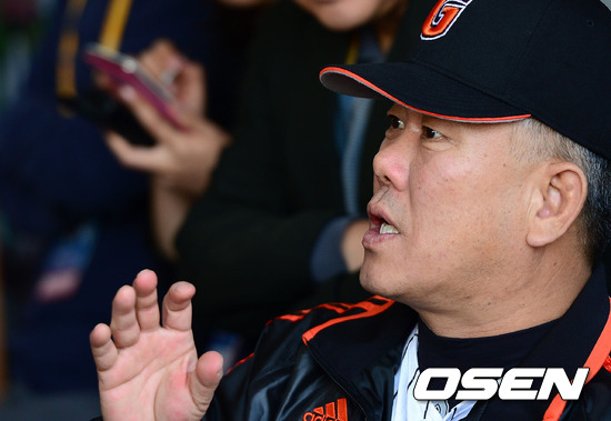 19일 오후 부산 사직구장에서 열린 2012 팔도 프로야구 플레이오프 3차전 롯데 자이언츠와 SK 와이번스의 경기, 경기에 앞서 롯데 양승호 감독이 취재진과 이야기를 나누고 있다.