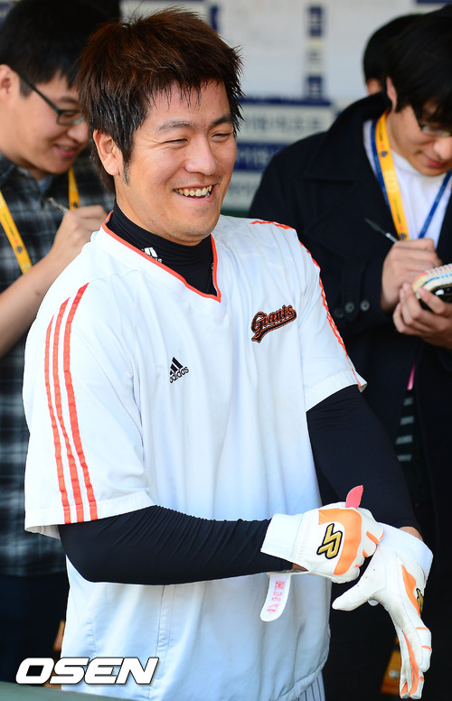 19일 오후 부산 사직구장에서 열린 2012 팔도 프로야구 플레이오프 3차전 롯데 자이언츠와 SK 와이번스의 경기, 경기에 앞서 훈련을 준비하는 롯데 강민호가 환하게 미소짓고 있다.