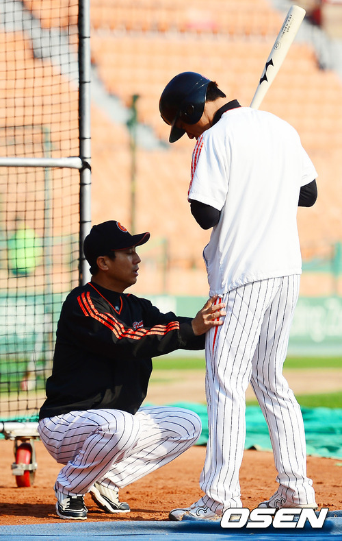 19일 오후 부산 사직구장에서 2012 팔도 프로야구 플레이오프 3차전 롯데 자이언츠와 SK 와이번스의 경기가 열릴 예정인 가운데 경기 전 롯데 박정태 코치가 김주찬의 타격을 지도하고 있다.