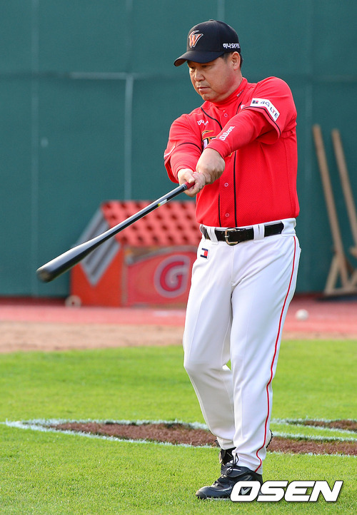 19일 오후 부산 사직구장에서 열린 2012 팔도 프로야구 플레이오프 3차전 롯데 자이언츠와 SK 와이번스의 경기, 경기에 앞서 SK 이만수 감독이 선수들의 타격훈련을 바라보며 배트를 휘두르고 있다.