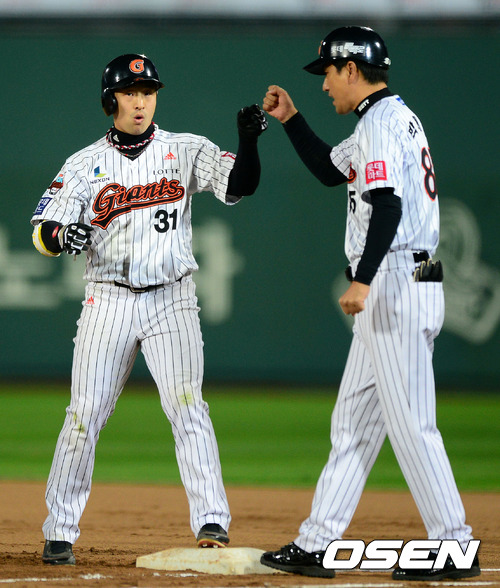 19일 오후 부산 사직구장에서 열린 2012 팔도 프로야구 플레이오프 3차전 롯데 자이언츠와 SK 와이번스의 경기, 1회말 무사 1,3루 롯데 손아섭이 우전 선제 적시타를 치고 박계원 코치와 하이파이브를 하고 있다.