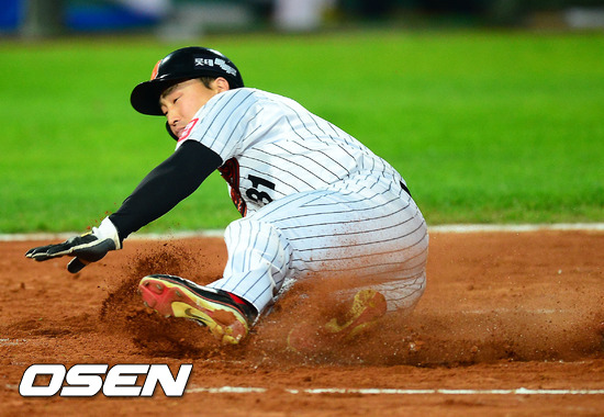 19일 오후 부산 사직구장에서 열린 2012 팔도 프로야구 플레이오프 3차전 롯데 자이언츠와 SK 와이번스의 경기에서 1회말 1사 주자 1,2루 롯데 전준우의 좌익수 앞 1타점 적시타때 손아섭이 홈으로 몸을 던지고 있다.