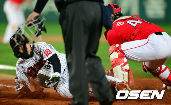 19일 오후 부산 사직구장에서 열린 2012 팔도 프로야구 플레이오프 3차전 롯데 자이언츠와 SK 와이번스의 경기, 1회말 1사 1,2루 롯데 전준우의 좌전 적시타때 2루주자 손아섭이 홈으로 쇄도해 세이프되고 있다.