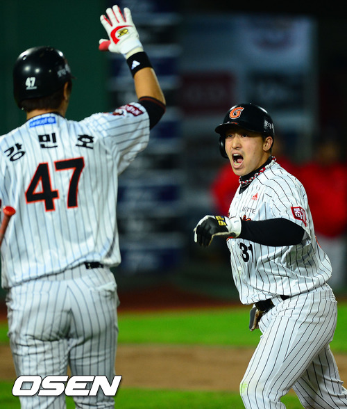 19일 오후 부산 사직구장에서 열린 2012 팔도 프로야구 플레이오프 3차전 롯데 자이언츠와 SK 와이번스의 경기에서 1회말 1사 주자 1,2루 롯데 전준우의 좌익수 앞 1타점 적시타때 손아섭이 홈에서 세이프 된 후 강민호와 하이파이브를 하고 있다.
