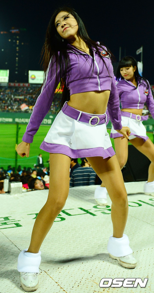 19일 오후 부산 사직구장에서 열린 2012 팔도 프로야구 플레이오프 3차전 롯데 자이언츠와 SK 와이번스의 경기에서 롯데 치어리더 김연정이 화려한 무대를 선보이고 있다.