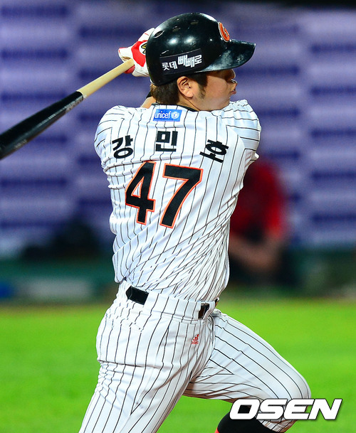 19일 오후 부산 사직구장에서 열린 2012 팔도 프로야구 플레이오프 3차전 롯데 자이언츠와 SK 와이번스의 경기에서 3회말 2사 주자 2루 롯데 강민호가 중견수 왼쪽 1타점 적시타를 날리고 있다.