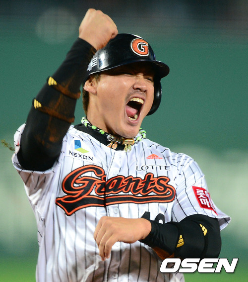 19일 오후 부산 사직구장에서 열린 2012 팔도 프로야구 플레이오프 3차전 롯데 자이언츠와 SK 와이번스의 경기, 3회말 2사 2루 롯데 강민호의 중전 적시타때 홈으로 쇄도한 홍성흔이 득점에 성공하고 환호하고 있다.