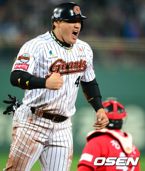 19일 오후 부산 사직구장에서 열린 2012 팔도 프로야구 플레이오프 3차전 롯데 자이언츠와 SK 와이번스의 경기, 3회말 2사 2루 롯데 강민호의 중전 적시타때 홈으로 쇄도한 홍성흔이 득점에 성공하고 환호하고 있다.