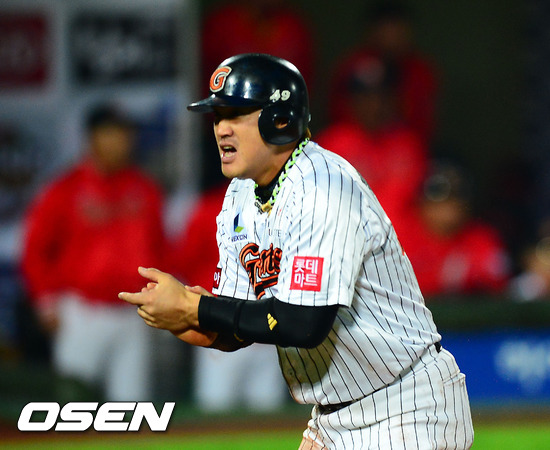 19일 오후 부산 사직구장에서 열린 2012 팔도 프로야구 플레이오프 3차전 롯데 자이언츠와 SK 와이번스의 경기에서 3회말 2사 주자 2루 롯데 강민호가 중견수 왼쪽 1타점 적시타때 홍성흔이 홈으로 몸을 날리며 세이프 된 후 기뻐하고 있다.