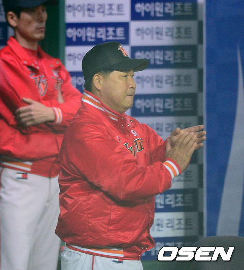 19일 오후 부산 사직구장에서 열린 2012 팔도 프로야구 플레이오프 3차전 롯데 자이언츠와 SK 와이번스의 경기, 5회말 SK 박정배가 롯데 전준우를 삼진으로 처리하자 이만수 감독이 박수를 치고 있다.