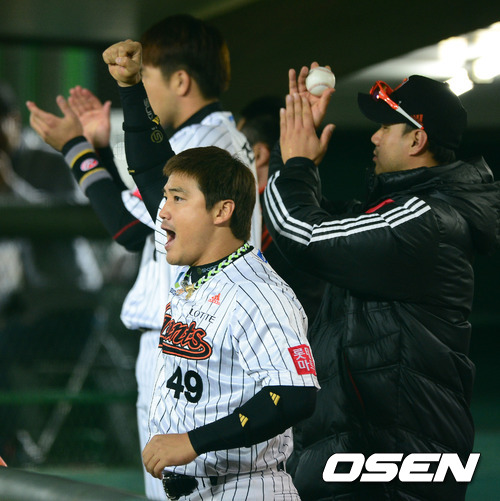 19일 오후 부산 사직구장에서 열린 2012 팔도 프로야구 플레이오프 3차전 롯데 자이언츠와 SK 와이번스의 경기, 9회초 1사 SK 모창민이 외야플라이로 물러나자 더그아웃에서 롯데 선수들이 환호하고 있다.