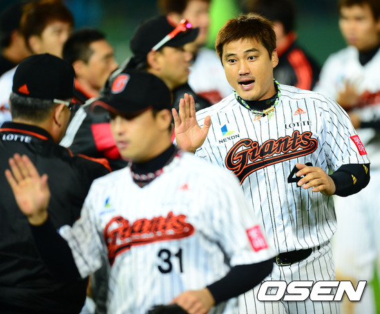 경기를 마치고 롯데 홍성흔이 양승호 감독과 하이파이브를 하고 있다. / rumi@osen.co.kr