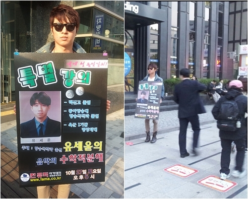 사진 속 유상무는 강남역에서 '특별 공연'이라고 쓰인 피켓을 들고 서 있다. 피켓 속 사진의 주인공은 유상무의 절친 유세윤이었고 주제는 ‘방송 극작과 출신 유세윤의 음악의 수학적 분해’였다. 하지만 주위의 사람들은 유상무에게 전혀 시선을 주지 않은 채 가던 길을 가거나 신문을 읽고 있는 모습을 보여 보는 이를 폭소케 했다.