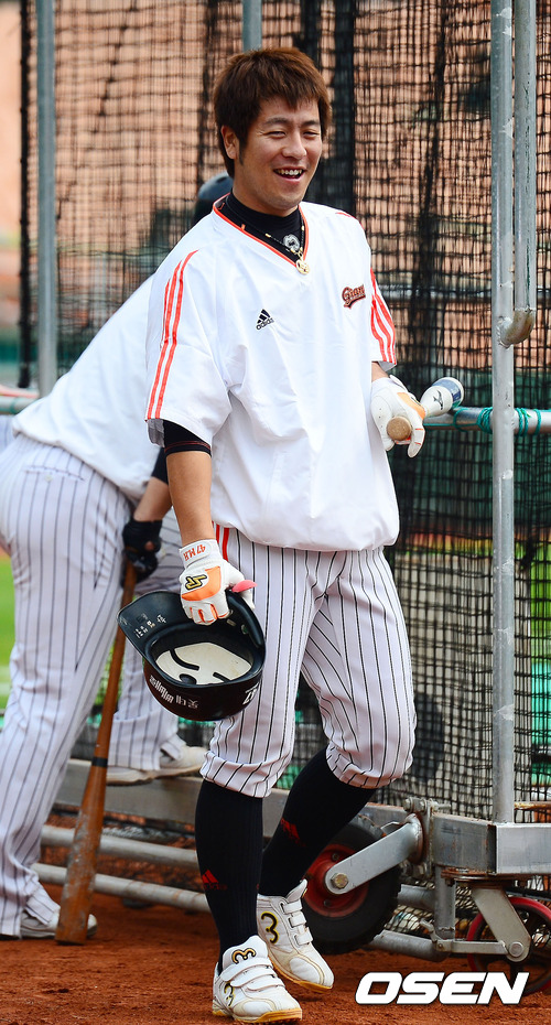 20일 오후 부산 사직구장에서 2012 팔도 프로야구 플레이오프 4차전 롯데 자이언츠와 SK 와이번스의 경기가 열릴 예정인 가운데 롯데 강민호가 환하게 웃으며 타격연습을 하러 나가고 있다.