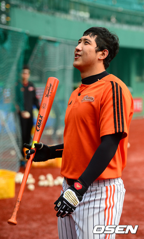 20일 오후 부산 사직구장에서 2012 팔도 프로야구 플레이오프 4차전 롯데 자이언츠와 SK 와이번스의 경기가 열릴 예정인 가운데 롯데 황재균이 관중석을 향해 환하게 웃으며 말을 하고 있다.