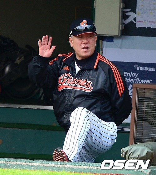 20일 오후 부산 사직구장에서 열린 2012 팔도 프로야구 플레이오프 4차전 롯데 자이언츠와 SK 와이번스의 경기에 앞서 양승호 감독이 이만수 감독을 향해 손을 흔들고 있다.