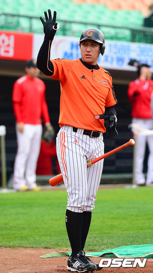 20일 오후 부산 사직구장에서 2012 팔도 프로야구 플레이오프 4차전 롯데 자이언츠와 SK 와이번스의 경기가 열릴 예정인 가운데 롯데 황재균이 타격연습을 기다리며 손을 흔들고 있다.