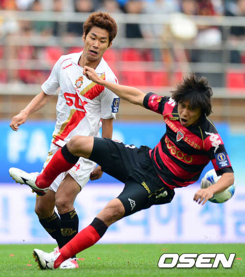 20일 오후 포항 스틸야드에서 열린 '2012 FA컵 결승전' 포항 스틸러스와 경남 FC의 경기, 전반 포항 김광석이 경남 윤일록의 공격을 차단하고 있다.