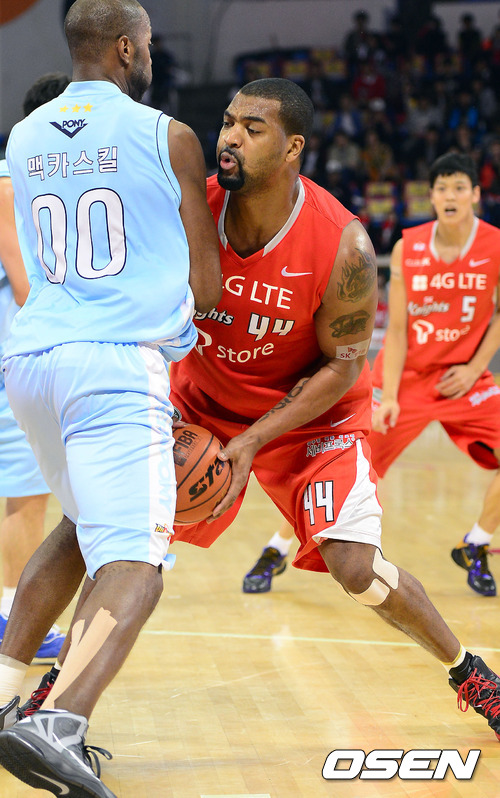 20일 오후 잠실학생체육관에서 열린 'KB 국민카드 2012-2013 프로농구' 서울 SK 나이츠와 울산 모비스의 경기, 1쿼터 SK 알렉산더가 모비스 맥카스킬의 수비에 막혀 돌파구를 찾고 있다.