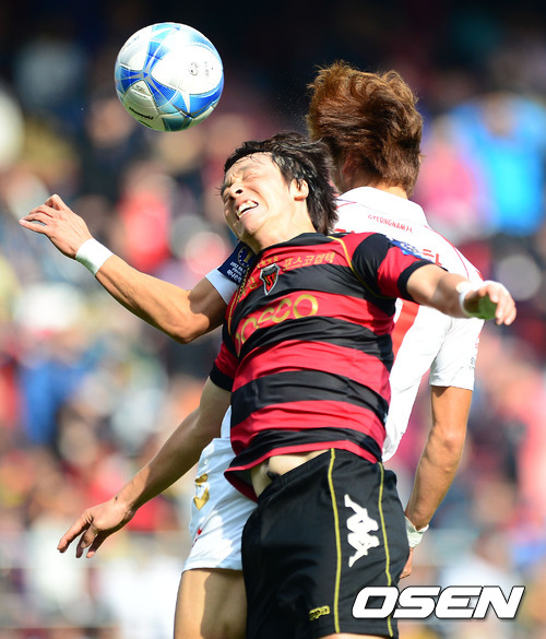 20일 오후 포항 스틸야드에서 열린 '2012 FA컵 결승전' 포항 스틸러스와 경남 FC의 경기, 전반 포항 박희철과 경남 김인한이 공중볼 다툼을 하고 있다.