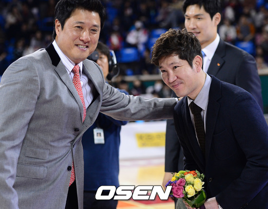 20일 오후 잠실학생체육관에서 열린 'KB 국민카드 2012-2013 프로농구' 서울 SK 나이츠와 울산 모비스의 경기 하프타임 황성인이 문경은 SK 감독에게 꽃다발을 전달받고 있다.