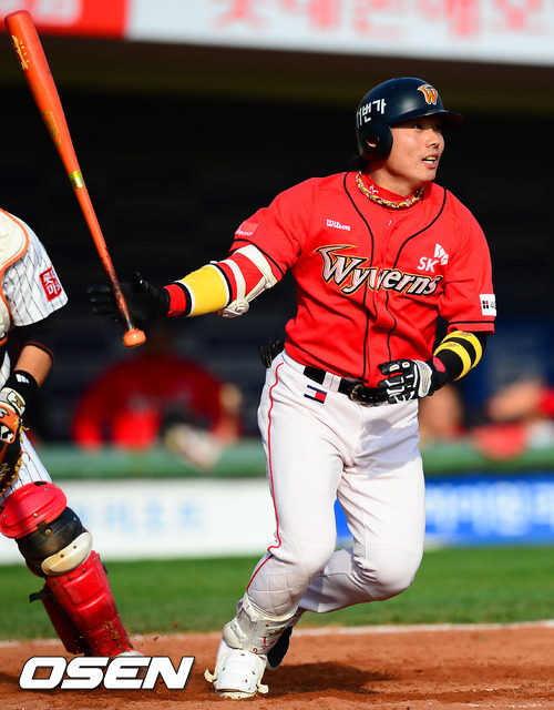 20일 오후 부산 사직구장에서 열린 2012 팔도 프로야구 플레이오프 4차전 롯데 자이언츠와 SK 와이번스의 경기, 5회초 1사 주자 1루 SK 박재상이 우익수 오른쪽 선취 1타점 적시타를 날리고 있다.