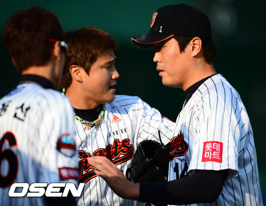 20일 오후 부산 사직구장에서 열린 2012 팔도 프로야구 플레이오프 4차전 롯데 자이언츠와 SK 와이번스의 경기, 5회초 수비를 마친 롯데 강영식이 덕아웃에서 동료들과 하이파이브를 하고 있다.