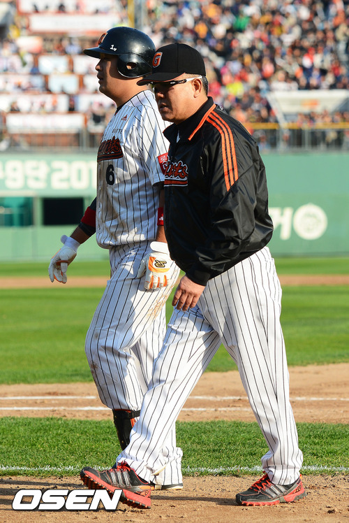 20일 오후 부산 사직구장에서 열린 2012 팔도 프로야구 플레이오프 4차전 롯데 자이언츠와 SK 와이번스의 경기 5회말 1사 문규현이 내야땅볼을 치고 1루에서 아웃이 선언 주심에 어필을 하자 양승호 감독이 나와 문규현을 데려가고 있다.