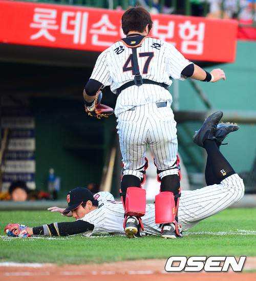 20일 오후 부산 사직구장에서 열린 2012 팔도 프로야구 플레이오프 4차전 롯데 자이언츠와 SK 와이번스의 경기, 8회초 1사 주자 1루 SK 박진만의 파울타구를 롯데 3루수 황재균이 몸을 날려 잡아내 아웃시키고 있다.