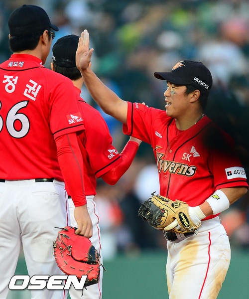 경기를 마치고 SK 정근우가 마운드 근처에 모여서 동료들과 하이파이브를 하고 있다. / rumi@osen.co.kr