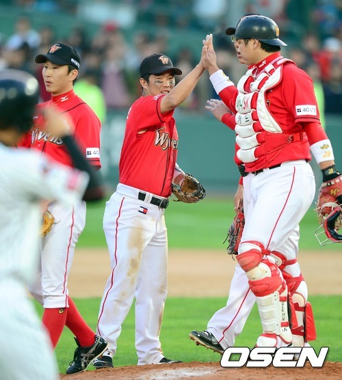 승리를 거둔 SK 선수들이 마운드에 모여 승리의 기쁨을 나누고 있다./spjj@osen.co.kr